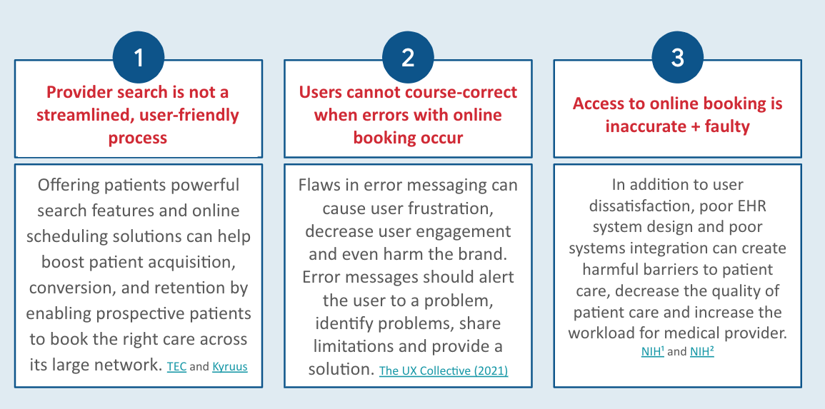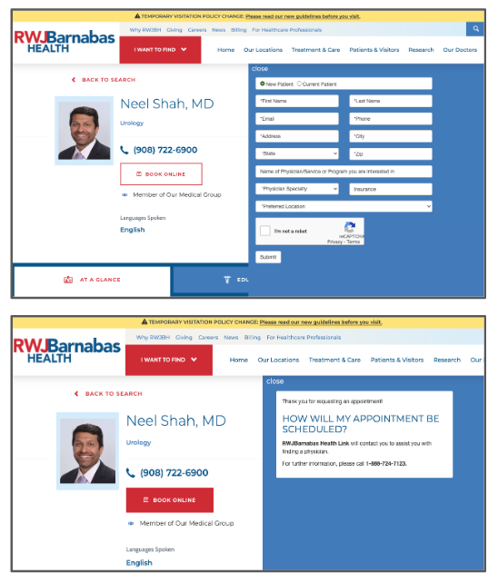 CHALLENGE: Despite growing trends in the adoption and use of online scheduling by hospitals and their patients, RWJBH users continue to struggle to find a provider and book online appointments and instead resort to calling the hospital’s telephone service, which is expensive and time-consuming for RWJBH staff.