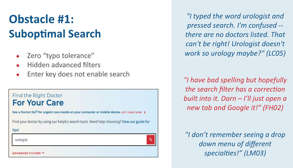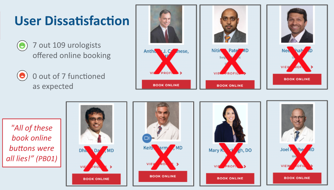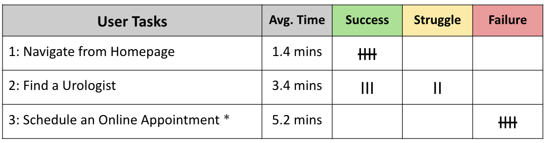 Moderated Usability Studies: I conducted five remote moderated usability tests via Zoom and asked users to do a concurrent “think aloud” (CTA) as they completed the following tasks and answered follow-up questions: 1) tour and navigate from the homepage; 2) find a provider (an urologist); and, 3) book an online appointment. Video and audio of the studies were recorded with users’ consent.