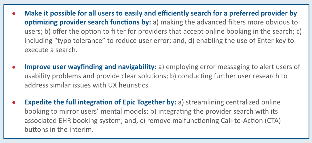 Implementation of the following recommendations will immediately improve users’ access to online booking and streamline the scheduling process, but has the potential for immediate and long-lasting impact: