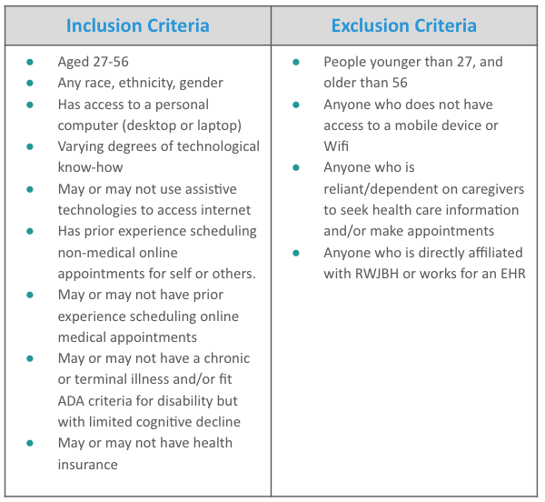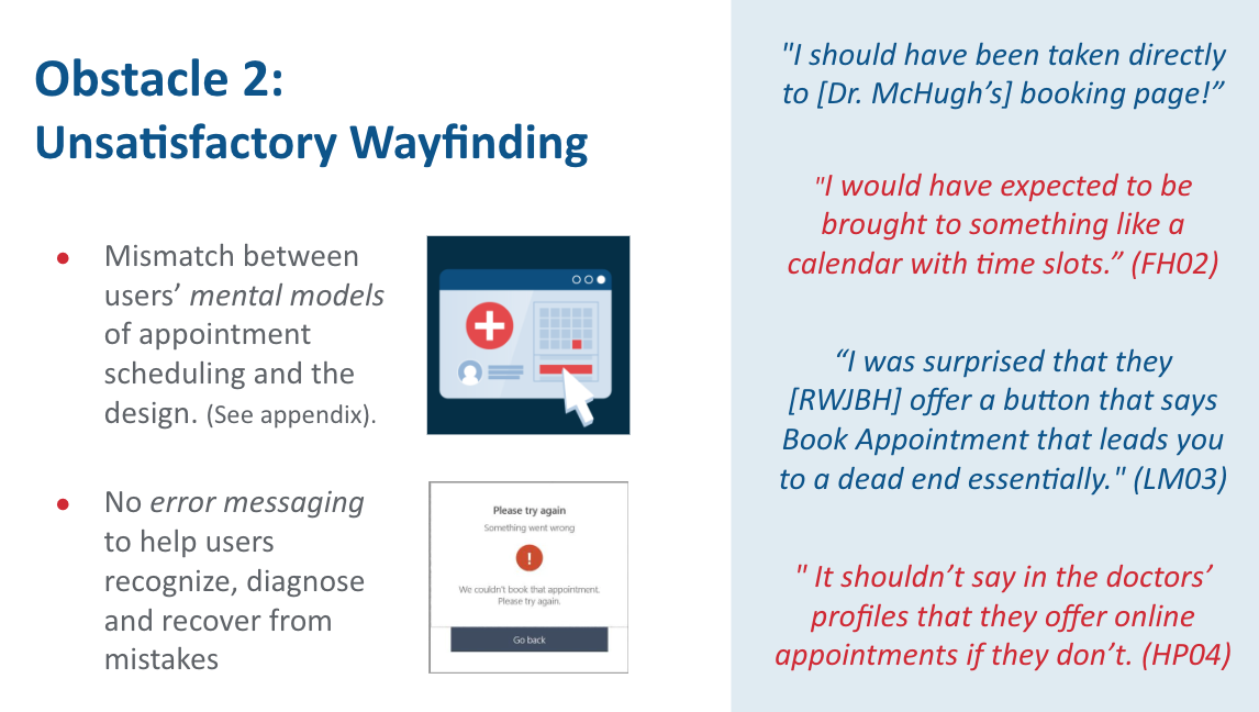 While this research study provides important insights into why RWJBH users struggle with online booking, there are several limitations that are to be considered: usability studies only conducted on urology department; small sample size (n=5); selection bias (participants were friends and family members that were easy to access and schedule); time constraints; lack of incentive for participants; and, all participants were white. Though this does not reflect my deep belief in inclusive research practices, I do not believe this impacted the results of the study.