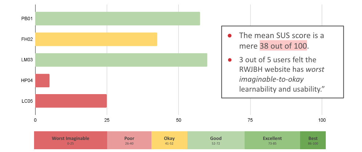 System Usability Scale (SUS): a System Usability Scale (SUS) was given to the same five participants to quantitatively assess the learnability and usability of a website by scoring 10 standardized questions with one of five responses that range from Strongly Agree to Strongly Disagree. It is a reliably valid tool, though not a diagnostic one.