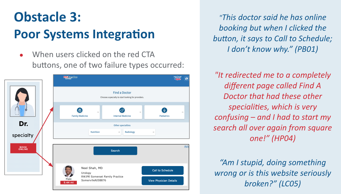 Several obstacles to online booking were uncovered during usability testing. Users felt that suboptimal search functions, unsatisfactory web navigation, and a lack of systems integration led to a poorer user experience than was expected for a health system of this scale.